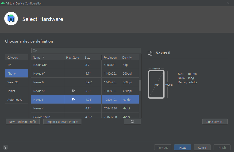 저는 학교에서 Nexus 5 로 항상 해서 Nexus 5로 선택하고 next