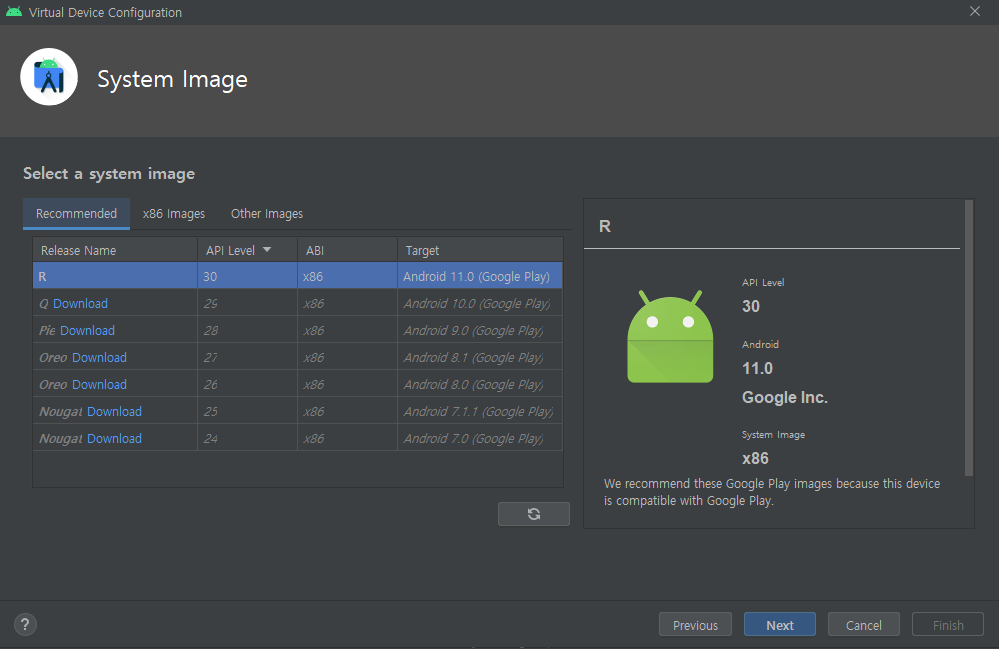 버추어 디바이스의 안드로이드 버전을 다운로드 해준다